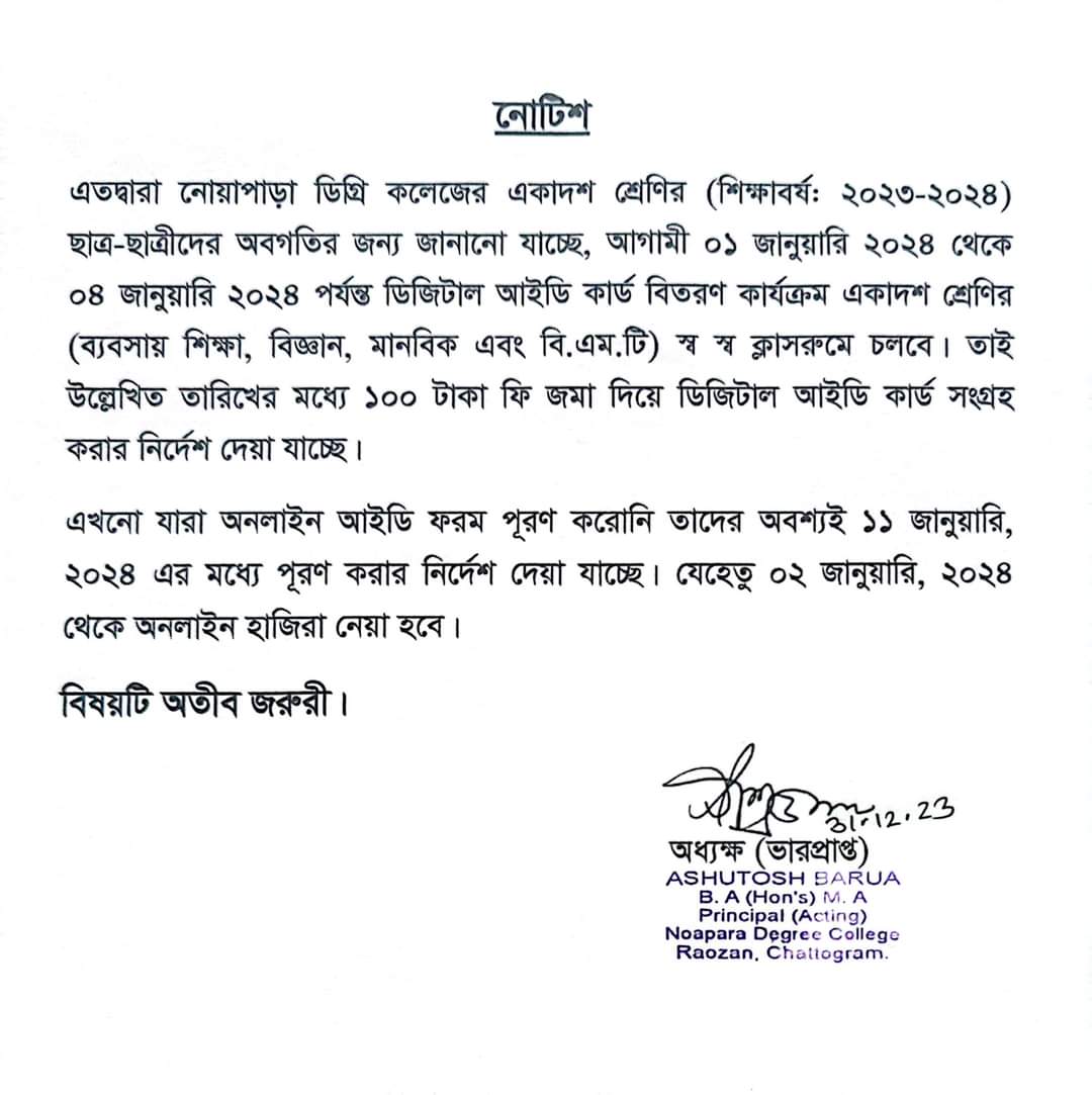 একাদশ শ্রেণির (শিক্ষা বর্ষ-২০২৩ - ২০২৪) ডিজিটাল আইডি কার্ড বিতরণ ০১ জানুয়ারি, ২০২৪ থেকে ০৪ জানুয়ারি,২০২৪ পর্যন্ত।